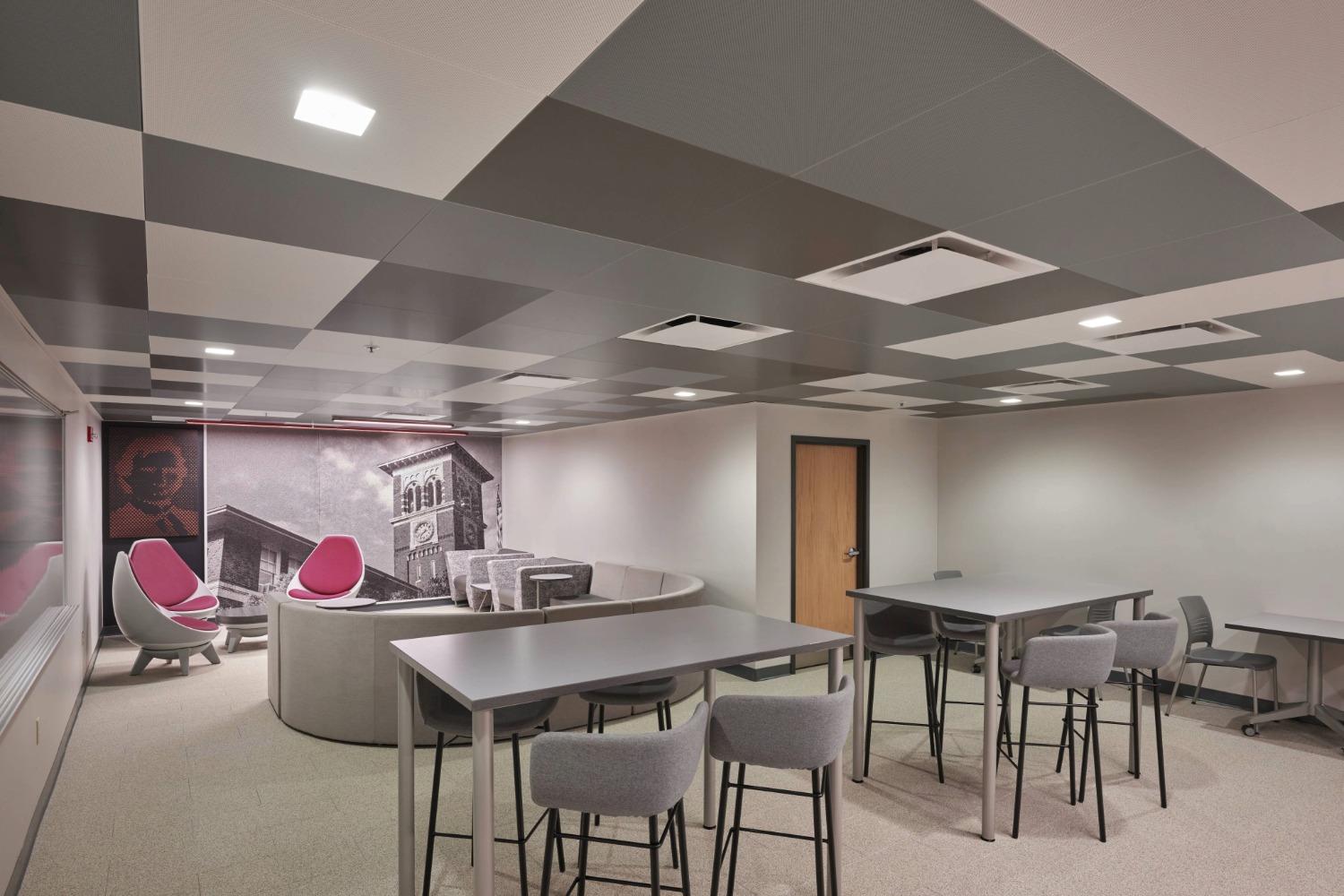 The full scope included acoustic ceiling and wall baffles to mitigate sound in the open studio, new artwork and furnishings that skillfully reflect the college’s branding, followed by new flooring throughout.