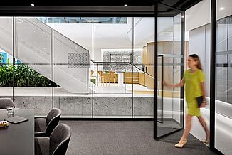 Using the color Mountain Top, Gensler chose REGUPOL revolution to course through hallways, flank sections of carpeting, wood, and other flooring materials to designate functional spaces and even run under glass partition walls for a consistent look inside and outside conference rooms.