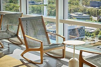 Equal parts stylish and functional, Revolution is heavy-duty commercial flooring with unmatched durability and versatility wrapped in a design-forward aesthetic. Made in America using post-consumer recycled tire rubber, its high-density construction provides outstanding resilience and shock absorption, making it ideal for areas with heavy foot traffic or demanding usage. The flooring’s advanced sound-dampening properties, equal to that of low-pile carpeting, create quieter, more comfortable environments — crucial for high-energy office settings. With easy installation, 4mm thickness and diverse color options, REGUPOL commercial flooring provided a fully customized look that transitions seamlessly to other flooring materials, completing Gensler’s vision for a modern design.