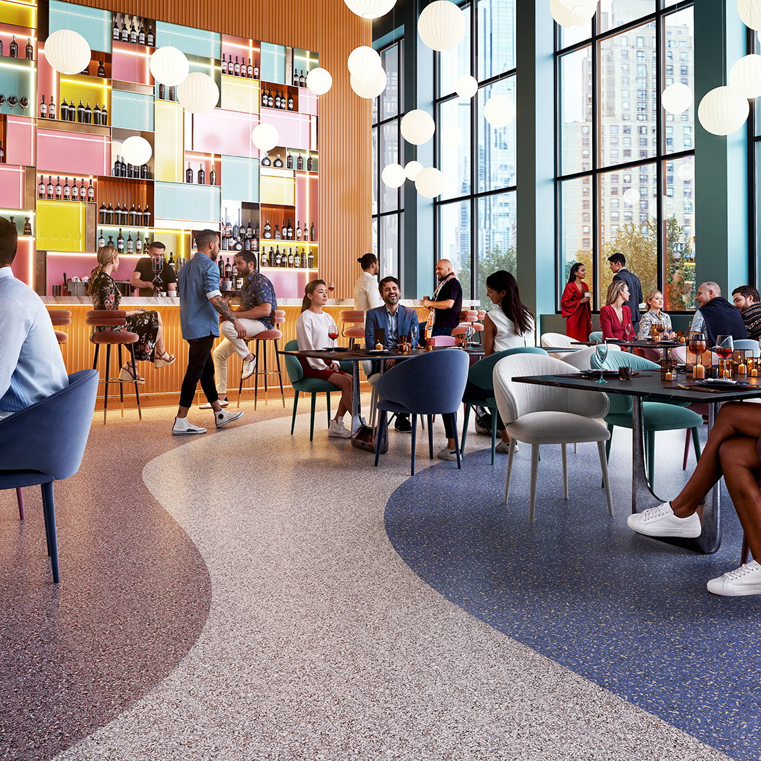 With sound-absorbing and cushioning properties, these flooring systems help create balanced acoustics that support natural conversation while reducing ambient noise. A durable, factory-sealed surface maintains a refined appearance and stands up to the demands of high-traffic hospitality spaces such as hotels, restaurants, lounges, and event areas.